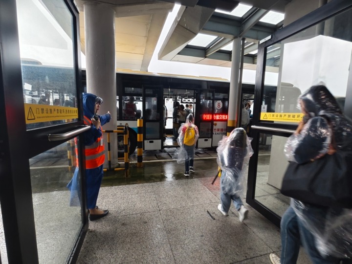 在上海浦东国际机场,东航为远机位登机旅客准备了雨披。在摆渡车、客梯车等点位,安排工作人员值守,及时为旅客提供帮助