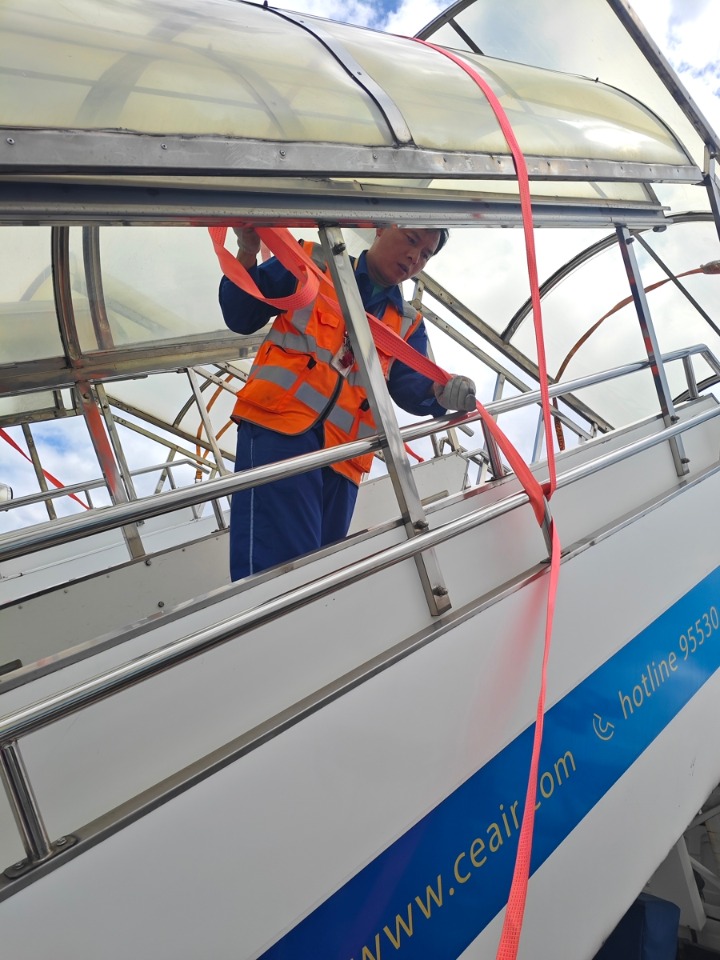 对于当日运行的航班,东航积极做好服务保障工作,重点加强对航空器和各类地面设施设备的检查,特别是关注客梯车、摆渡车、行李运输车等与旅客出行息息相关的车辆、设备运行顺畅。例如,东航为所有在雨天使用的行李运输车、货物拖斗车加盖了防水布,确保行李在装机、卸机过程中防护到位;地面摆渡车降低雨天行驶速度,并适当调高车内空调温度,避免旅客上下车经历“较大温差”。