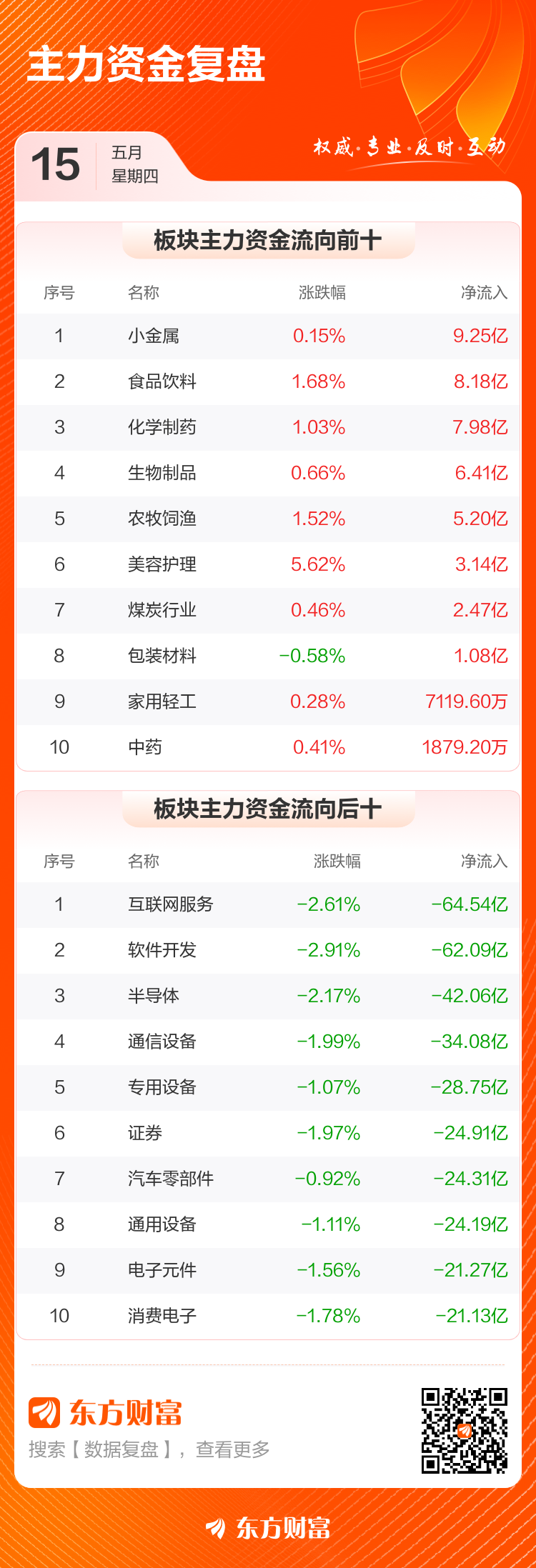 5月15日,沪指跌0.68%聚富人,深成指跌1.62%,创业板指跌1.91%。两市成交额1.15万亿,较上个交易日缩量1643亿。数据显示,今日大盘主力资金净流出629.17亿。小金属、食品饮料、化学制药等板块主力资金流入排名居前,其中小金属净流入9.25亿元。